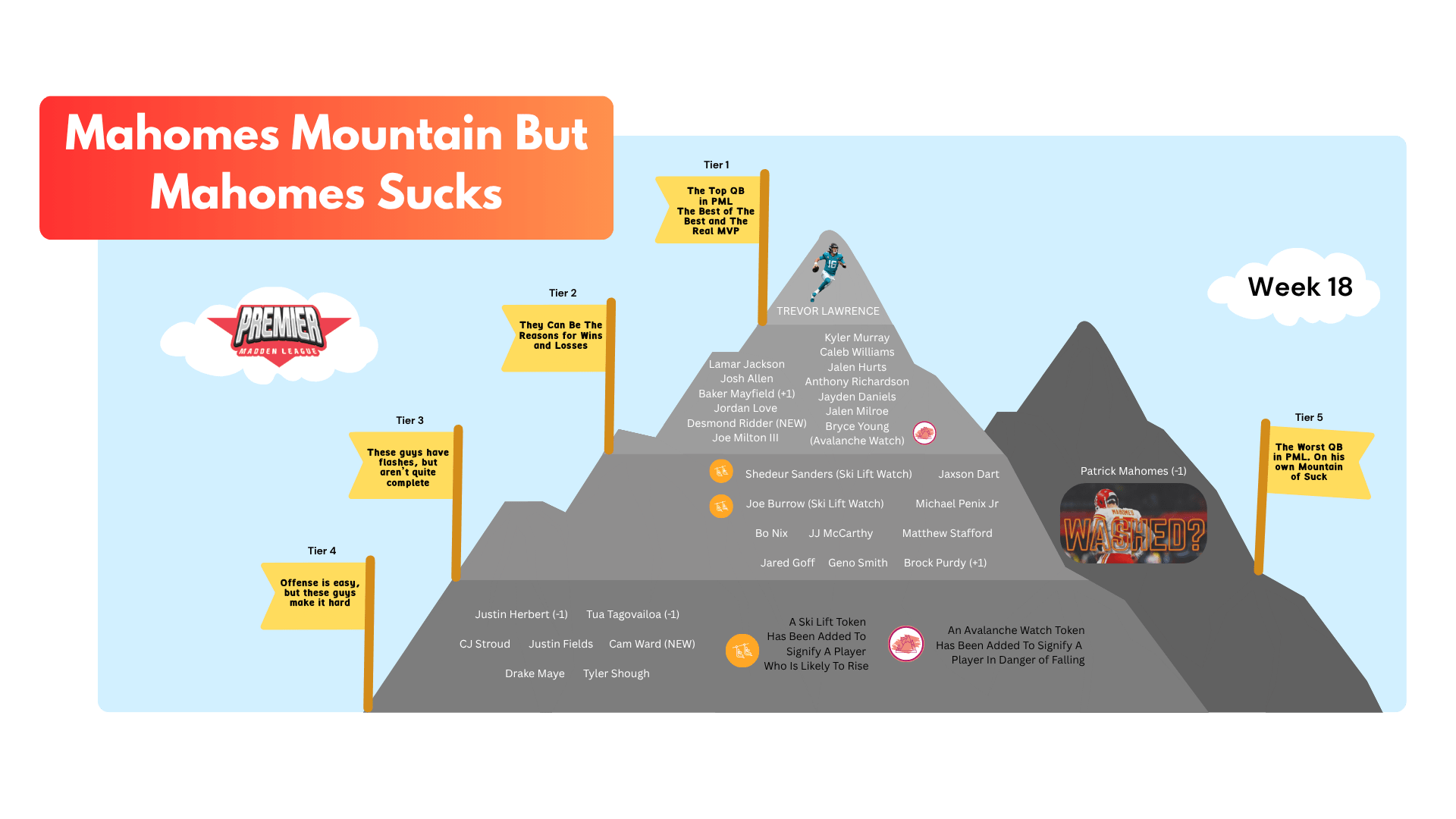 Mahomes Mountain But Mahomes Is On The Bottom Week 18: Tier TBD Rebranded! One More Chance To Move Up The Mountain!